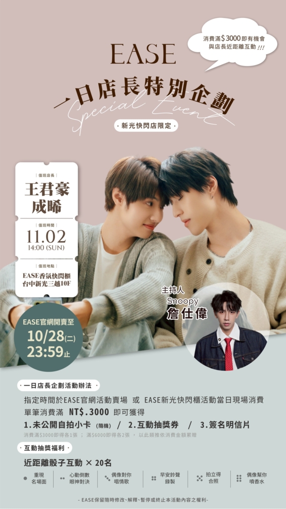 イベント当日、または10月28日(火)日本時間24:59までにEASE公式サイトのキャンペーン特設ページで商品を1回の購入で$3,000台湾ドル以上お買い上げいただくと購入特典がもらえます。
